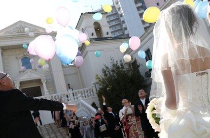 挙式後は大階段のセレモニーにて バルーンに囲まれたかわいらしい空間をご用意 お二人のこだわりのバルーンリリースを行いました! 天までお二人の幸せが届きますように…