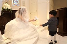 新婦お母様よりヴェールダウンがありお父様より新郎様へ「娘を世界一幸せにしてやってくれ」と硬い約束が。年の離れた弟様がいらっしゃるご新婦様。あまり弟様と一緒に過ごせなかったということで何か思い出を・・・ 弟様よりリングピローを受けとられました。たくさんの愛を感じながら晴れて夫婦となりましたヽ(^o^)丿