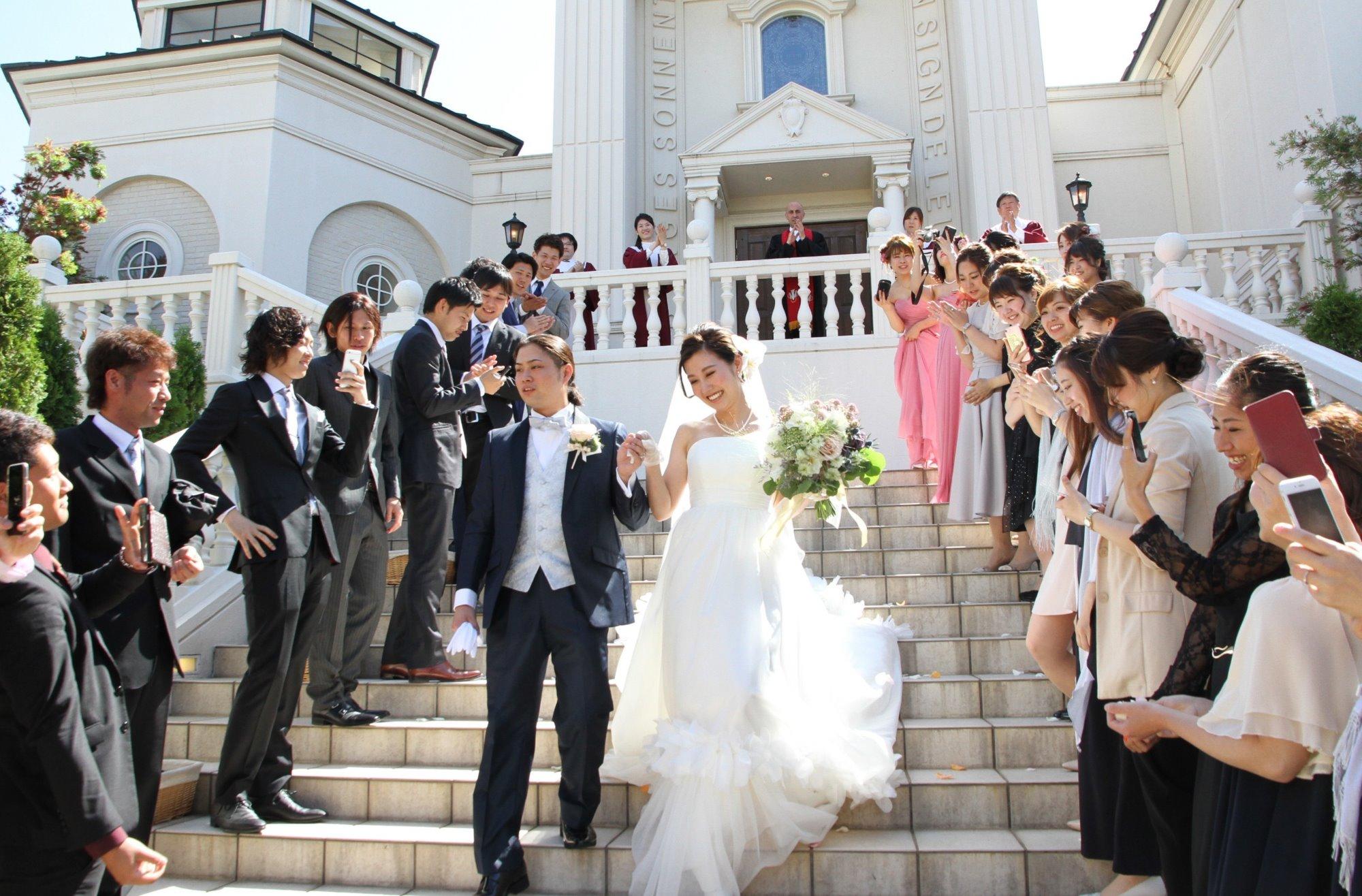 ゲストの皆様に楽しんでもらいたいとのお2人のご要望通り挙式後は晴天の中大階段でのフラワーシャワーです☆生花でのフラワーシャワーは本当に素敵でした!ご新郎様のエスコートもとてもスムーズでかっこよかったです!大階段を降りた後はブーケトス&チュパチャップトスなどの演出もご用意されました!