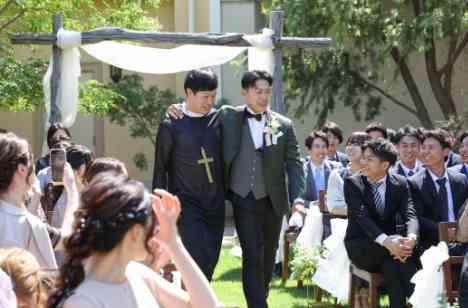 一般的なキリスト教式の結婚式では牧師が挙式の進行を進めて参りますが、自由な形式の人前式では、参加してくれたゲストの皆様に永遠の愛を誓います。そこでゲストの皆様もアッと驚くサプライズ演出として新郎様のご友人に牧師役を! オリジナリティ溢れる演出にゲストの皆様も大盛り上がり! 笑顔いっぱいのひとときとなりました。