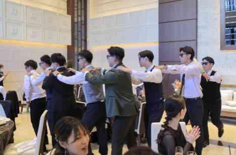 披露宴の中座エスコート役は『感謝を伝えたい方』 『今までお世話になった方』それぞれですが 今回、新郎様のご中座は大切なご友人様たちと... 新郎様を真ん中に、お揃いのサングラスを付けて みんなで仲良し列車になって出発進行♪ 会場の手拍子と音楽に合わせてのご中座は アットホームで普段の仲の良さが伝わるワンシーンになりました。