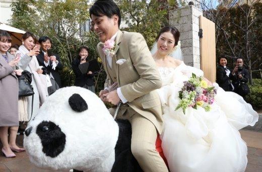 リゾートガーデンでのウェルカムパーティー入場の際にはお二人が会場見学の時からやりたい!と決めて頂いておりました馬・・いやいやパンダカーに乗ってご登場です(*^^)v アッシャーやブライズメイドなど沢山のゲストの皆様がお写真を撮られておられました★ パンダカーからご新婦様が降りる際のご新郎様のエスコートっぷり・・・とーっても素敵ですね♡