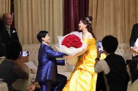 披露宴の結びには新郎様から新婦様へサプライズ演出を! 101本の薔薇とネックレスを新婦様へプレゼント♡ 101本のバラの花束には「これ以上ないほど愛しています」という意味を持っており 普段中々直接言えない想いを込めれば、素直に想いを届けることができるはず... 愛する人との特別な日にその想いを伝えるのにぴったりです! 大きな薔薇の花束に新婦様もびっくり!とっても嬉しそうな表情が素敵です