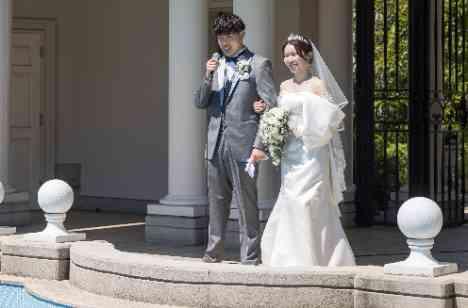 挙式披露宴、二次会と丸1日当館でお過ごしいただいた新郎Rさんと新婦Aさん♡結婚式当日は天候にも恵まれ、晴れやかな青空と太陽の下、当館でおこなうことができる外のスペースでのイベントも存分に楽しまれました。プールサイドでおこなわれるウェルカムパーティもそのうちのひとつ♡挙式が結び披露宴が始まるまでのこの時間で、おふたりからゲストへのご挨拶がありました♪