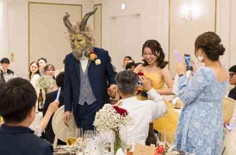 披露宴のテーマは赤いバラが似合うプリンセスの映画に♡会場内を彩る装花はもちろん赤いバラをメインに考えられました。お色直しではネイビーのタキシードとイエローのカラードレスにチェンジ♪テーマに忠実に新郎様は被り物をしてのご登場です。世界観を大切にされたおふたりの姿にゲストから歓声が沸き起こり、ペンライトとカメラを両手にとても盛り上がっているご様子でした!
