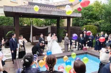 お打ち合わせを進めていく中で、バルーンの演出を取り入れることにしたおふたりが選んだのは『ドロップ&フライ』♡プールの中にゲストと一緒に一斉にバルーンを投げ入れると、やがてバルーンが自然と空へ舞い上がっていく幻想的なセレモニーです。プールがついている会場だからこそできる演出は、新郎新婦様が選ばれた会場の特別感をより際立たせますね…♡