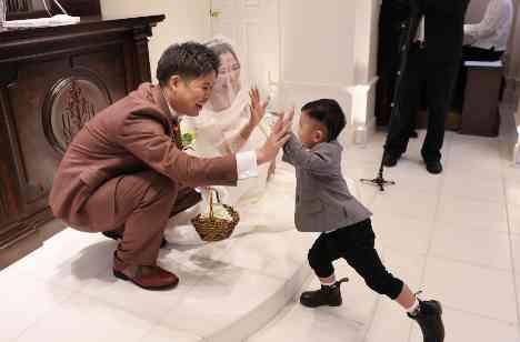 白亜の大聖堂アスピラシオン教会で人前式をとりおこなったおふたりは、ご家族様やゲストに演出を手伝っていただく場面を取り入れ、アットホームさを大切にされました。リングボーイを務めてくれたのは、ご友人様のお子様。リハーサルからしっかりとした足どりでバージンロードを歩き頼もしい様子でしたが、本番でもばっちり大役を務めてくれ、指輪を渡したのちは新郎新婦様とハイタッチも!
