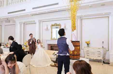 楽しいことが大好きなおふたりは、自分たちだけでなくゲストにも楽しんでいただくことに重きを置き、披露宴では黒ひげ危機一髪ゲームを開催!参加者となったゲストにはドキドキしながら樽にナイフを差し込んでいただきました。そしてゲーム中盤、突如勢いよく樽から大量の金テープが発射されると、新郎新婦様もゲストもその勢いにびっくり!天井高い空間を金テープが派手に舞い上がりました♪