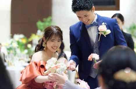 お色直しでは新郎様はネイビーのタキシード、新婦様は艶感が素敵なテラコッタのドレスへチェンジ。ガラッと印象を変えたおふたりは、入場後ゲストのテーブルへご挨拶に周りました。その際に配られたのは、優しいピンクの色味が可愛らしいガーベラの花。写真を撮る時にフォトアイテムとして使っていただいたり、男性はスーツの胸ポケットに挿していただくなど、会場を一層華やかに彩ってくれました♡