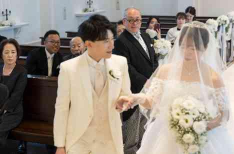 ご親族様とご友人を招いてアットホームな空間で愛を誓い合ったおふたり。挙式の入場シーンでは新婦お父様から新郎様へ、新婦様をバトンタッチされる瞬間を皆様で見守りました。とても優しい表情を浮かべながら“いってらっしゃい”と言うかのように送り出したお父様と、受け取った新婦様の手をしっかりと握りながら祭壇までエスコートされた新郎様。静かなやり取りの中にも様々な想いが垣間見え、心温まる挙式の時間となりました。