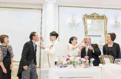 結婚式の1日を通して親御様への感謝の想いをたくさん伝える日にしたいと、ご披露宴ではケーキセレモニーで親御様にサプライズ♡突然前へ呼ばれ驚かれた様子の親御様に、新郎新婦様からウェディングケーキをおすそ分けされました。幸せを贈る意味もあるウェディングケーキのプレゼント。美味しそうに召し上がってくださった親御様に、ゲスト皆様の表情もほっこりと幸せを感じられているようにも見えました♡