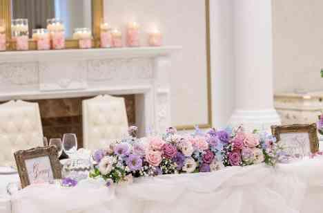 お打ち合わせの中で会場を彩る装花をじっくりと悩まれたおふたり。新婦様のカラードレスに合わせた色味であることと、季節感を大切にしながらもほっとするような印象を希望されていたことから、パステルカラーのピンク・ラベンダー・水色のグラデーションをご提案。可愛らしい雰囲気が好きとのことで、新郎新婦様が座るメイン席のテーブルには、ふわふわのチュールを飾り華やかに仕上げました♡