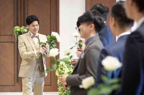 白いバラをお二人の共通のご友人やお子様などにお持ちいただき、そのバラを挙式にて新郎様が入場される際に1輪ずつ集め、新婦様へブーケとしてお渡しいただきます。ゲストの皆様のお力を借りて、ブーケを完成させる素敵なセレモニーです。新郎様お一人でご入場されるのは少し照れくさい、ゲストの皆様にご参加いただきたいとお考えのお二人にぴったりの演出でした。