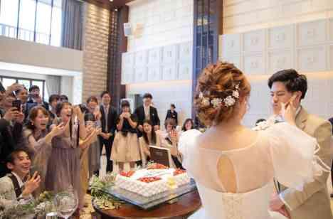 初めての共同作業といわれるケーキ入刀の後、新郎様からは「一生食べるものに困らせない」、新婦様からは「一生美味しいご飯を作り続ける」という意味を込めて、お互いにケーキを食べさせあっていただきました。新婦様が大きなスプーンでたっぷりとケーキをすくい、新郎様の鼻に生クリームがたっぷり付いてしまいましたが、お二人らしい可愛らしいシーンとなりました♡
