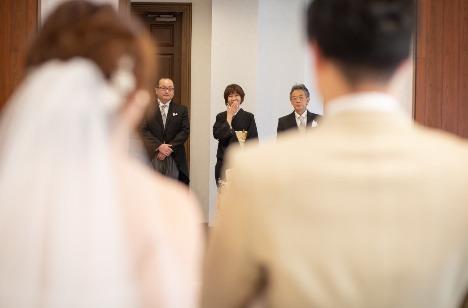ドレス・タキシードに身を包み、お支度が整ったお二人のお姿をチャペルにて最初にご覧になったのは、親御様でした。扉が開いた瞬間、照れくさそうに、でも幸せそうな表情をされているお二人のお姿を、親御様も嬉しそうに見つめていらっしゃいました。幸せな1日のスタートを飾るのにふさわしい温かいセレモニーでした。