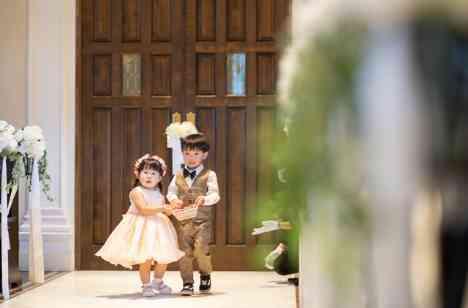挙式では可愛い甥っ子くんと姪っ子ちゃんにリングボーイ&ガールとして登場していただきました!キョロキョロと周りを見渡しながらも手をつないで一歩一歩指輪を大切に運び、無事におふたりのもとへ指輪を運んでくれました♪ ゲストや、少し緊張されていた新郎新婦様もお顔が綻ぶ、とてもほっこりするシーンとなりました。