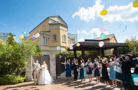 挙式が結んだ後のウェルカムパーティ―では、ゲストの皆様にバルーンをお配りし、バルーンリリースを行いました☆ゲスト全員におひとつずつカラフルなバルーンをお持ちいただき、青空いっぱいに広がるバルーンはとても幻想的で、小さなお子様でもご参加いただきやすいのでゲスト参加型の演出をお考えの方にオススメの演出です。