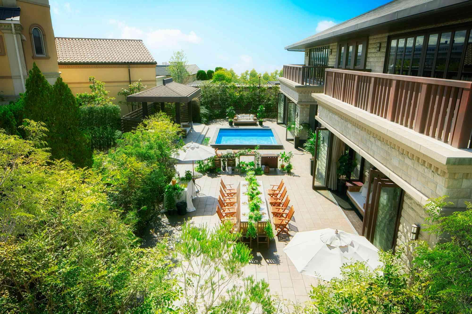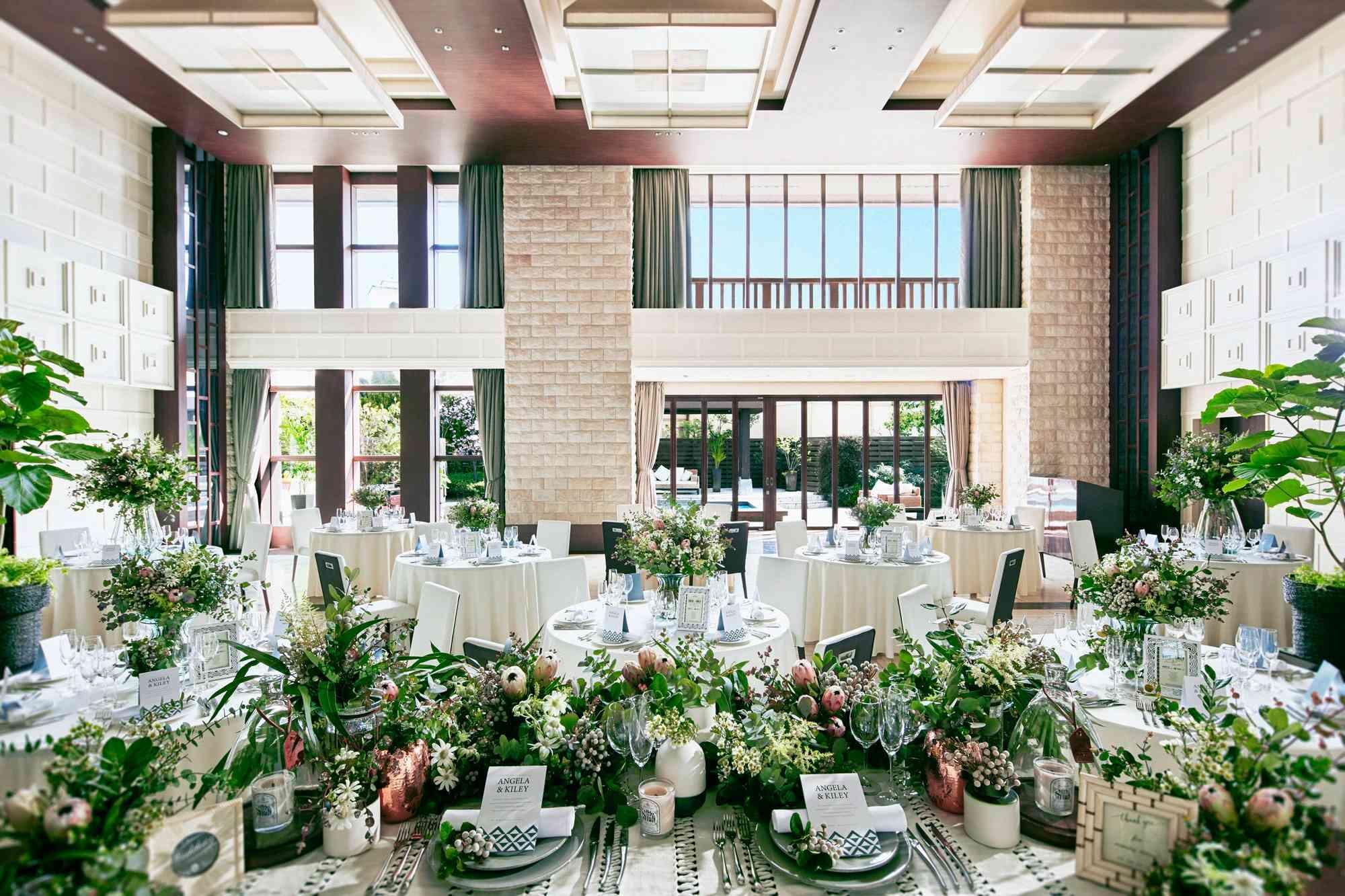 リゾートホテルをイメージした、天井高約6mの開放的な空間。プール付きのプライベートテラスと会場を一体にして、動きのある多彩な演出が叶う。窓を開けての換気も可能なのでゲストも安心(着席:~121名)