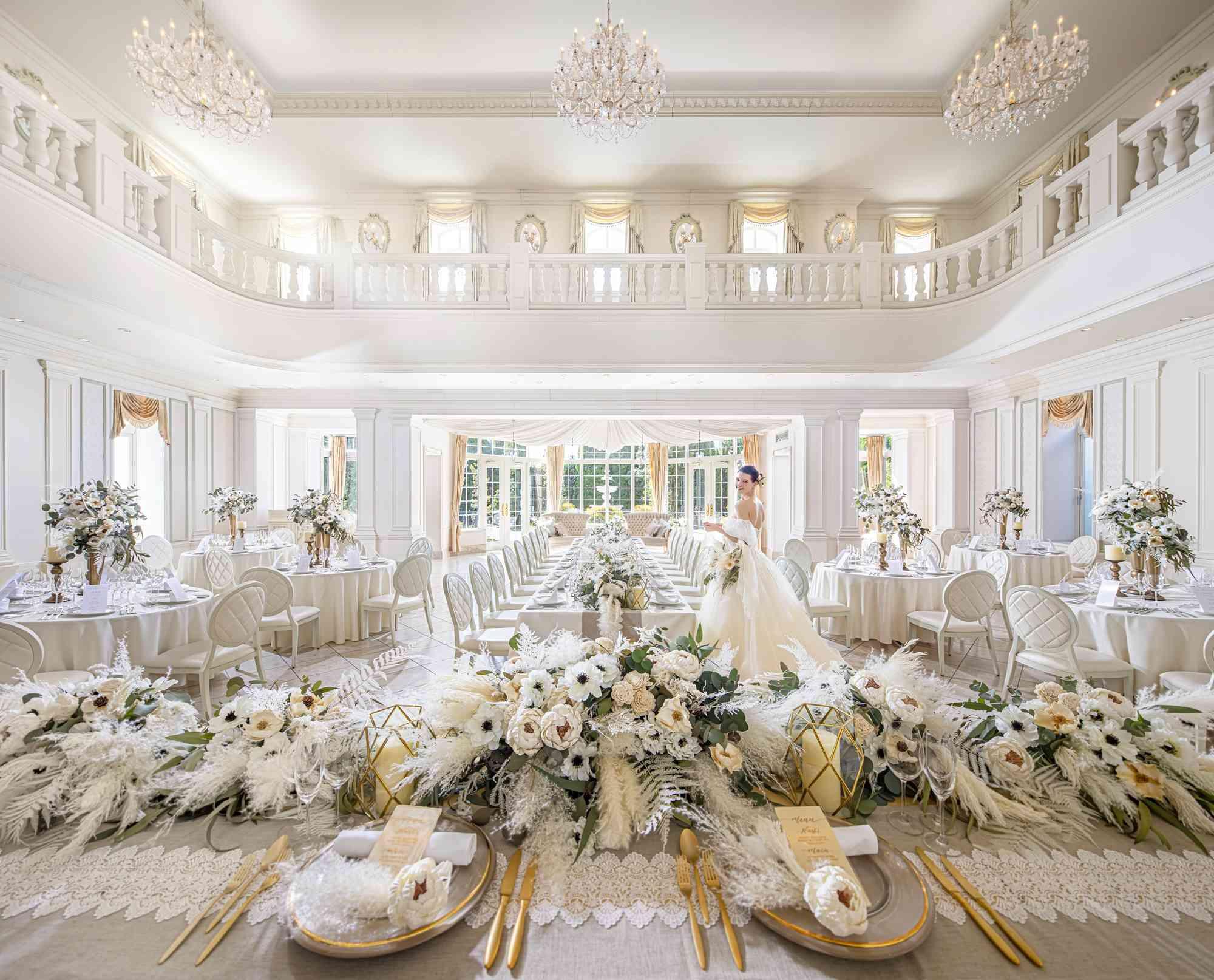 吹き抜けの天井にシャンデリアがきらめき、アンティーク調の絵画やソファなど花嫁の憧れを形にした邸宅。大きな窓からは360度に自然光が射し込み、ガーデンの緑を眺めながら過ごすひと時(着席:~100名)