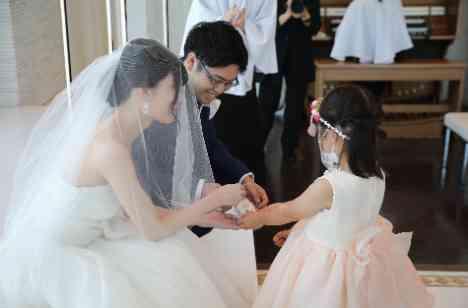 挙式スタイルは教会式で執り行いまいした。緊張した面持ちでご入場された新郎様。お母様からベールダウンを行って頂き、一歩一歩お父様とバージンロードを進まれる新婦様。お2人の緊張が会場にも伝わる挙式でしたが、指輪の交換シーンでリングガールちゃんの登場があり、挙式会場内に笑顔が溢れる素敵なお式となりました。