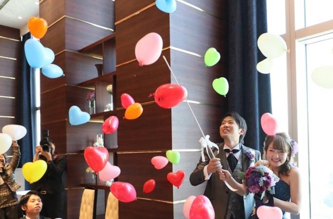新郎様新婦様 タキシードとドレスをお召しかえ♪ 雰囲気が変わり大人っぽいコーディネートです! 各テーブル毎のお写真でラウンドした後は・・・ スパークバルーン♪♪ おふたりの幸せがあふれました~♡ 女性のゲスト様やお子様が風船を集めてくださいました!