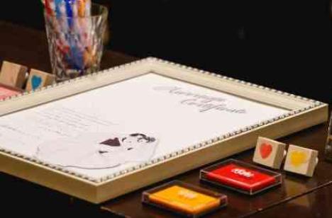 お待合ロビーにはおふたりのオリジナル『結婚証明書』をご準備されました。結婚式の思い出を、ずっと形に残したいというおふたりの想いを形にすることに!真っ白なキャンバスにタキシード・ウエディングドレスを着た新郎新婦様の似顔絵が♡そこにゲストの皆様がハートのスタンプを押し準備完了☆挙式の時に新郎新婦のおふたりで仕上げをしました。そして、唯一無二で世界にひとつだけの結婚証明書が完成しました♡