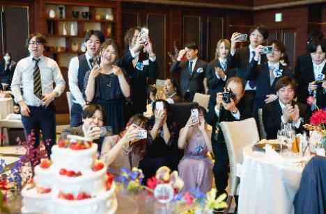 会場の生花やテーブルコーディネートにもこだわったおふたり。華やかでトレンド感のある空間でご披露宴がスタート!!! ご挨拶・乾杯・歓談と進み、お二人のケーキ入刀へ。ゲストの皆様に祝福されながら行うケーキ入刀セレモニーは、絆を感じられる大切な瞬間に。おふたりのの周りは大好きなゲストの皆様でいっぱいになり、「おめでとう♥」の歓声で包まれました。