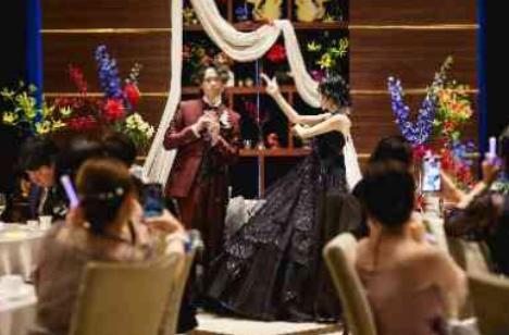 お色直しはウエディングドレスとはガラッと雰囲気を変えてブラックのシルバーラメが散りばめられたスタイリッシュなドレスへ☆全く違った姿にゲストからも歓声と拍手が鳴り響きました。再入場し、曲のサビが始まると・・・おふたりからサプライズスタート☆ノリノリの曲に合わせて、ダンスを踊るご新郎新婦様の様子に、ゲストは予想以上の盛り上がりを見せサプライズは大成功♪