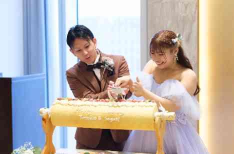 司会者のアナウンスでウェディングケーキが登場すると、ゲスト皆様からは歓声が…!なんと登場したのは定番の生クリームのケーキではなく、長い長いバウムクーヘンでした。バウムクーヘンには「幾重にも重なった年輪のように末永い幸せが続きますように」といった願いが込められており、結婚式でも縁起の良い引き菓子として知られています。そんな特別なケーキは、新郎新婦様の手によって粉糖をかけていただき完成です♡