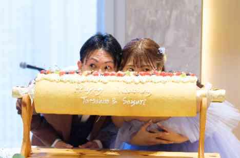 司会者のアナウンスでウェディングケーキが登場すると、ゲスト皆様からは歓声が…!なんと登場したのは定番の生クリームのケーキではなく、長い長いバウムクーヘンでした。バウムクーヘンには「幾重にも重なった年輪のように末永い幸せが続きますように」といった願いが込められており、結婚式でも縁起の良い引き菓子として知られています。そんな特別なケーキは、新郎新婦様の手によって粉糖をかけていただき完成です♡
