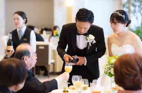 披露宴では、新郎新婦様が自らご親族様のテーブルにお酌をしに向かわれる場面も。 せっかくお集まりいただいたからこそ少しでもお話をし、両家の絆を深めるきっかけになればと、和やかに談笑される姿がありました。思い出話にも花が咲き、ご親族様だからこその目線で新たな門出の日を迎えられたことを喜んでくださる様子に、新郎新婦様も嬉しそうに、そして少し照れくさそうにされている表情が印象的でした。