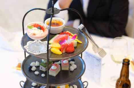 ご親族様を招いての披露宴なので、アットホームにゆったりと過ごしたいとイメージを持っていた新郎新婦様。 料理も楽しんでほしいと、コース料理のデザートはビュッフェに♡ゲストが歩いて取りに行く方法ではなく、テーブルに3段のアフタヌーンティー形式で提供されるワンテーブルビュッフェは、見た目も可愛くとても華やかです♪ゲストに立ち上がっていただく負担もないため、様々な年代の方に楽しんでいただけます♡