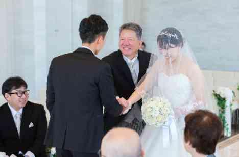 幼い頃から成長を見守ってくれたご親族様からのあたたかい眼差しに包まれ、お父様と新婦様はバージンロードを一歩ずつ歩まれました。 新婦様の手がお父様から新郎様へバトンタッチされる瞬間。それは、新婦様が新郎様との新しい未来へ一歩を踏み出す瞬間でもあります。緊張が走る場面でもありますが、お父様の柔らかい笑みで新郎新婦様もご親族様も笑顔が浮かび、心あたたまる瞬間となりました。