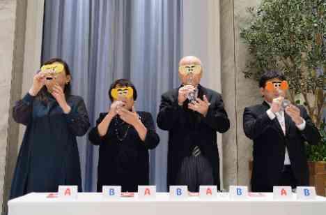 披露宴の後半では格付けゲームを開催♪ くじ引きで選出されたテーブル代表者に前に出てきていただき、どちらが高級な赤ワインや牛肉か当てていただく格付けチェックを。有名画家と新郎新婦様どちらが描いた絵か当てる目利きなどもおこない、ユニークな問題の数々に会場は大盛り上がり!優勝テーブルには豪華景品もプレゼントされ、楽しい時間を過ごされました♪