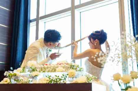 フルーツが敷き詰められた大きなウェディングケーキ♡お互いに食べさせ合うため新郎様が新婦様に用意されたのは、カレーを食べるサイズのスプーンでした。新婦様はちょっと大きめのスプーンに苦戦しながらも美味しそうにパクリ♪続いて新婦様が手にしたのは、シャベル…!予想外の大きさにゲストからはどっと笑いが。新郎様を応援する声も飛び交い、そんな期待に応えるべく顔にクリームが付きながらも頑張って食べてくれました!
