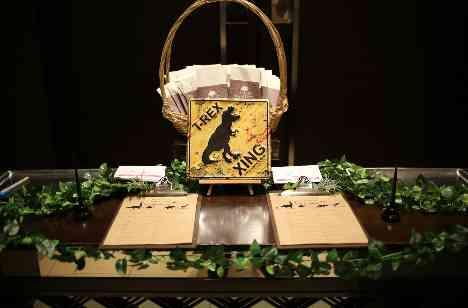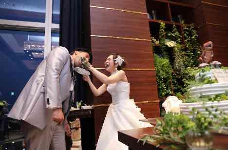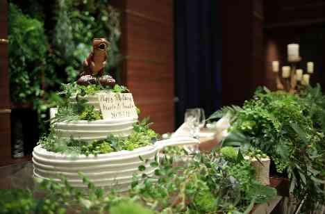 ケーキのデザインもナチュラルテイストにアレンジをしたものでございます。 ファーストバイトにもこだわりぬいたお二人★ 「私が一生おいしいご飯を作ります」と新婦様からのファーストバイトです。 ここで恐竜が登場します。 ゲスト様もびっくりでした!!