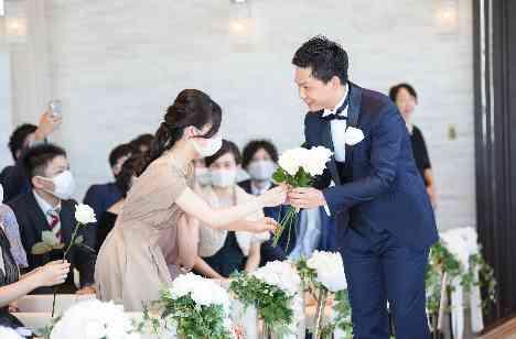 お式では12本のバラをゲストから集める ダーズンローズセレモニーをおこないました。 皆さまからのたくさんの想いがこもったバラを受け取った新郎様。 新婦様に改めて気持ちをお伝えされました。 皆さまに見守られながらのセレモニーはたくさんの祝福の拍手と あたたかなお祝いの言葉で溢れていました。