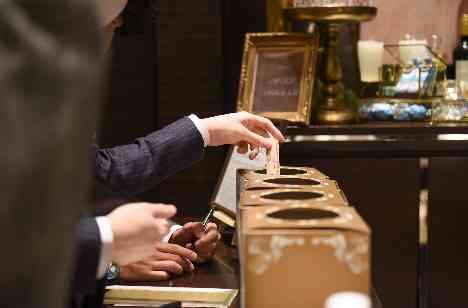 ゲストも参加できて何か楽しい演出はなかとお考えのうえ、 再入場での曲当てクイズを行うこととなりました。 受付で4曲の中から投票を頂き、ご入場! 扉が開いた瞬間ゲストの様々な声が飛び交い、 おふたりも楽しそうに入場をされました。 その後、投票頂いた方の中からおふたりのくじ引きにて景品プレゼントタイム☆ 豪華景品を手にされたゲストの方々とのお写真もばっちり収めて頂きました。