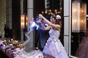 光の演出を使った幻想的な演出でのお色直し入場! お二人がそそぎ合う水が混ざり合ってきらきらときらめく水が、 更にご新婦様のドレスを引き立ててます❤思わずゲストも「わー!」と感動されてました♪