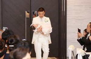 当日はとても緊張されていたおふたり。 まずはご新郎様、ゲストの方へおふたりのお子様をご披露をしたいと 挙式ではお子様を抱っこしておふたりでご入場となります!
