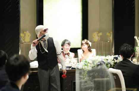 新郎様のお父様が、どうしてもお二人のパーティーでご余興がしたいとお話があり、何度もお電話でお打合せをさせていただきました。 なんとお父様は貞子で入場。会場内は何が始まるのかワクワクしていたら、ゲームが始まり当たっても外れてもお二人にプレゼントするとご準備されていた絵をプレゼント! その後は松山千春さんに変装してお二人にお歌のプレゼント。会場内も温かい空気に包まれました!