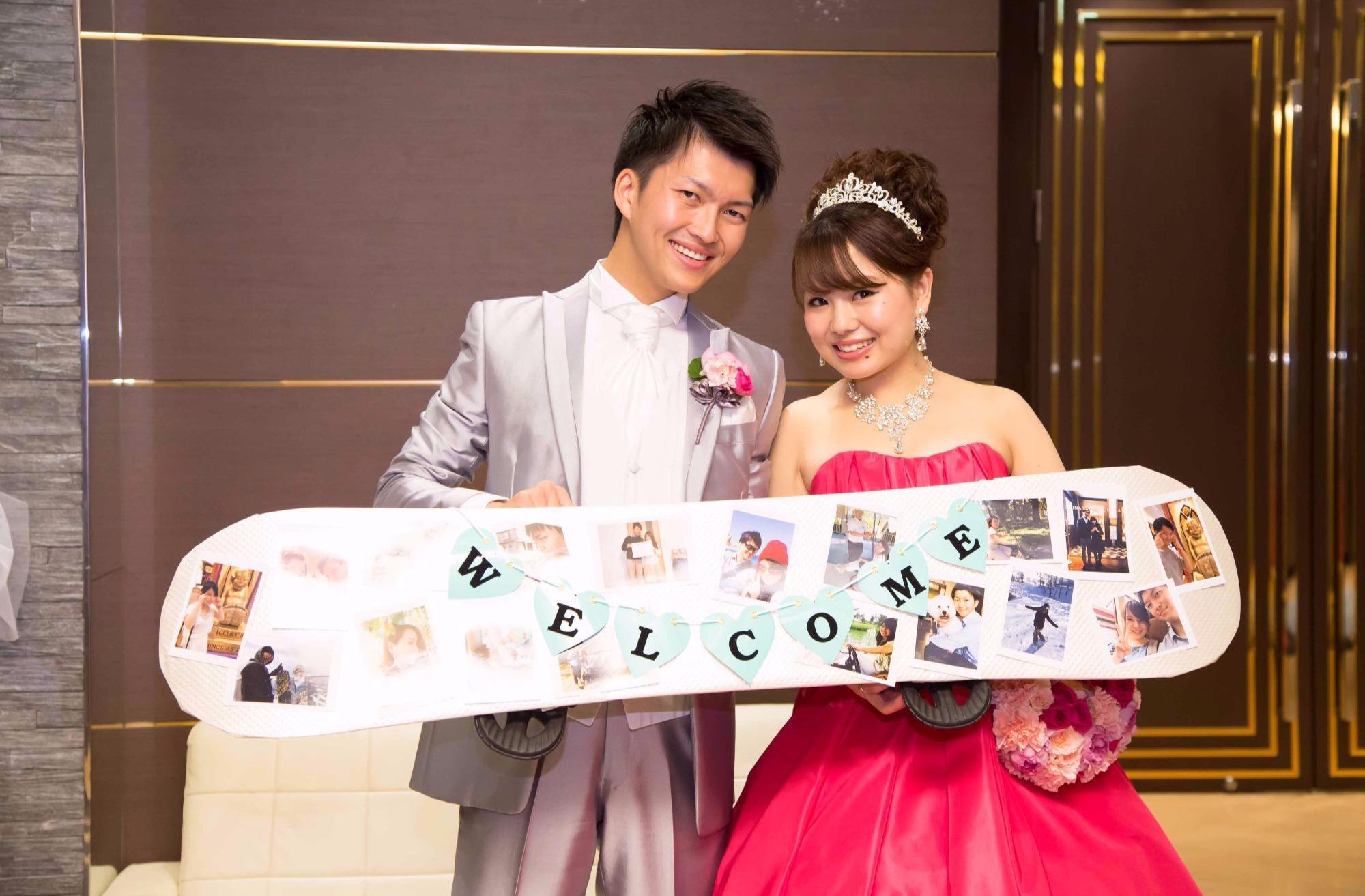 お互いの趣味がスノーボードだったので、ウェディングケーキは雪山でスノーボードを持った二人をデザインしてもらい、ウェルカムスペースにもスノーボードを飾りました。二人らしいと友人にも好評でした! 新婦は、ウェディングドレスで花冠、カラードレスではティアラと、あえて王道を外したコーディネートにも拘りました。