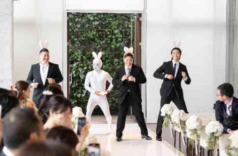 リングベアラー4名登場で、代表様のみミッフィーの衣装に着替えて 全員扉オープンしてご入場。 白塗りのミッフィー・・・!?と、登場の瞬間に全員が大笑い!! 意外なご入場に親御様、会社関係のゲスト様、そしてご友人の皆様と、全員が最高の笑顔であふれ、とてもおふたりが叶えたかった素敵な挙式となりました。