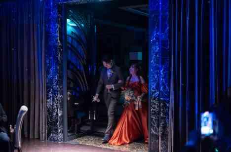 ゲスト様に受付にてドレス色当ての投票と幼少期の写真当てクイズの投票をしていただき、ご中座中に幼少期の正解発表のDVDが流れ盛り上がる中続けて再入場。スターライトレーザーがキラキラと煌めく中、皆様にすてきなドレスをお見せしながら練り歩きます・・・! 新しい姿で、美しい星空の中現れたおふたりにゲストの皆様は大盛り上がり!皆様を楽しませ続ける演出となりました。