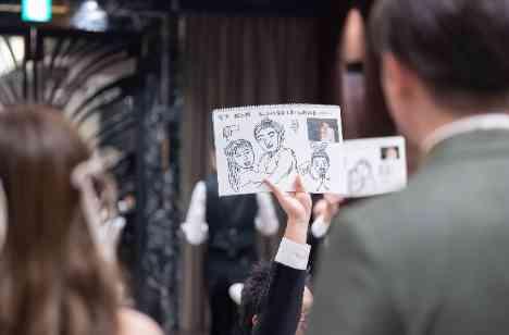 各テーブルにスケッチブックをお配りしてお2人の似顔絵をスケッチしていただきます。選考基準は「かわいさ」よりも「リアルで面白み」があること! みんなが書いてくださったスケッチブックを一斉にオープンしたときに、今日一番の笑顔があふれるお二人。 お二人の期待を超える最高に楽しいシーンとなりました。