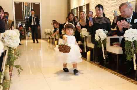 お二人のお子様にリングガールをお願いしたお二人。 可愛らしい白いドレスに身を包んで、緊張しながらも一歩ずつおふたりのもとへリングをお届け✨ そんなお姿にゲスト様が『がんばれー!』と応援するお姿も・・・ ご家族の思い出に残る大切な瞬間に、会場全体があたたかい雰囲気に包まれ、おふたり、ゲストの皆様が笑顔あふれる素敵なワンシーンでした。