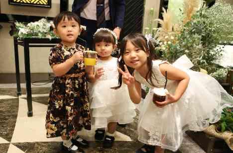 お二人のお子様と姪っ子ちゃんたちで乾杯のご発声。 みんなの笑顔とかわいい「乾杯!」の声でお二人の素敵なパーティが始まります・・・! 可愛らしい乾杯の音頭につい『可愛い〜〜!!』とのお声も♡ みんなが楽しめるパーティにふさわしい乾杯のご発声にお二人もゲストの皆様も大満足のイベントとなりました。