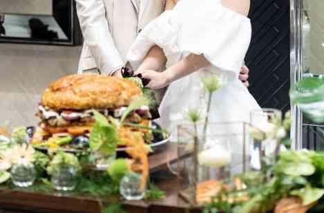 『少し変わったご結婚式がしたい!・・・!』そんな思いを叶えたアイテム、巨大ハンバーガー入刀です!🍔 おふたりとも大好きだというハンバーガー。だからこそみんなで食べたい!とのことでシェフ手作りでご用意しました♡ これにはおふたりも大喜び!ファーストバイトは小さな一口サイズのミニバーガーをご用意し、新婦様から新郎様へ♡ 大盛り上がりの素敵なシーンになりました♡