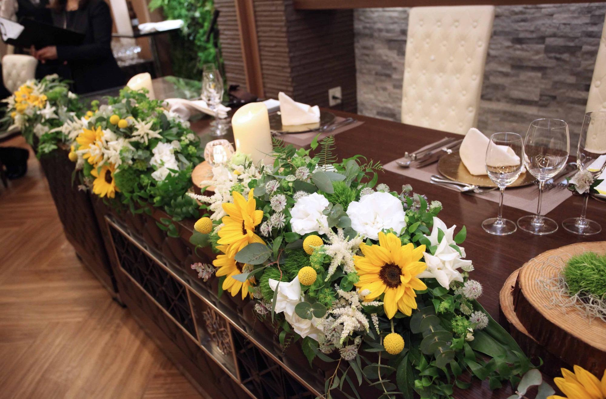 ひまわりを取り入れ初夏を感じさせる爽やかなコーディネートがとても素敵です♪ ご披露宴前半はご歓談時間をメインにケーキ入刀&ファーストバイトを行いました♪ 新郎新婦様の周りにはゲストの皆様がお手元にカメラをご準備され笑顔いっぱいです!