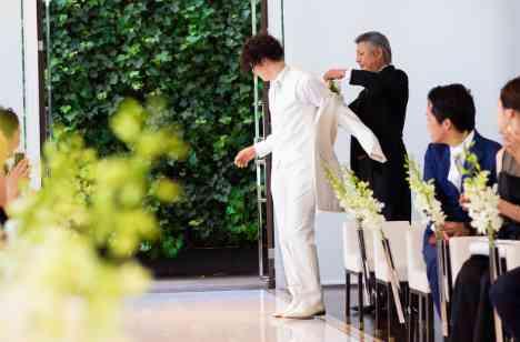 ご新婦様のお母様がご新婦様のベールをかける ベールダウンのセレモニーを行いました。 また、ご新郎様のお父様から、 ご新郎様にタキシードを着せて頂くという タキシードセレモニーを行いました。 お2人ともが親御様からの子育て最後の魔法をかけていただき、 笑顔に包まれた挙式となりました。